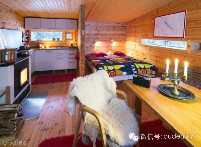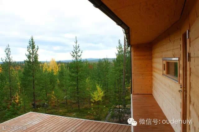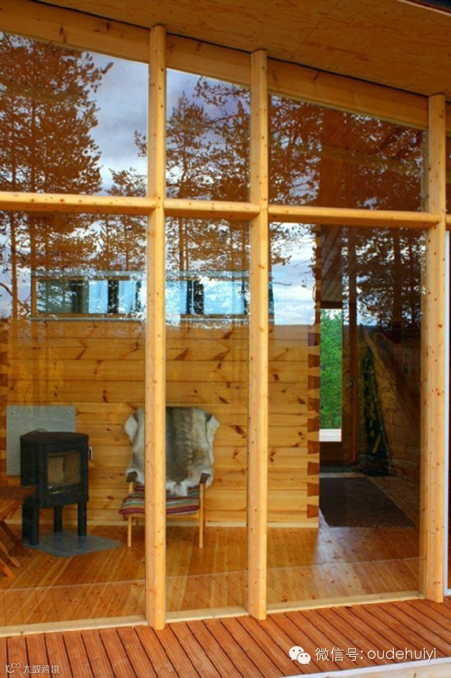 起居室和桑拿室的木质结构以鱼尾角接接头,这是典型的芬兰传统建筑系统。在起居室和桑拿室之间是一块地势较高的空间,有一扇大窗户,面向拉普兰森林砍伐的景观。