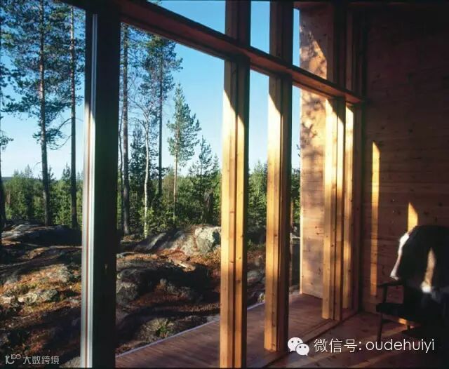瓦尔塔宁木屋别墅坐落于一块露出地面的岩石上,透过周围的森林面向远处的荒原。四周有死去的松树干、以前森林火灾的痕迹和精美的冰川巨石。本项目的任务就是设计一栋包括一间起居室和一个单独的桑拿木棚的世外桃源。建筑物之间有一个露台可以通往两个建筑。
