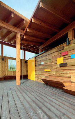 建筑师提取了“愤怒的小鸟”中几种特定的色彩,让前来游玩的小朋友们感到亲切友好。建筑师还特别设计了一些细节以方便小朋友的使用,如不同高度适合他们身高的室外座椅和手盆,多层次的丰富细节大大增强建筑的趣味性。