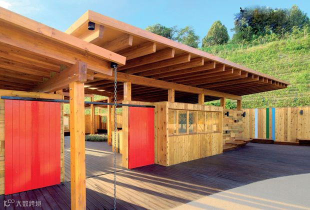 SLOW Architects设计的木结构咖啡厅结合园区特点,从多个方向都可以随意进出,形态清新,色彩缤纷。