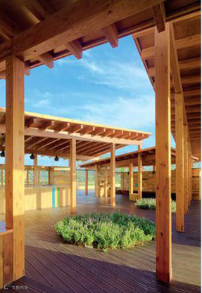 真正不同于传统木结构建筑的所在是预制结构, 它决定了建筑的设计思路、建造方式、日后使用以及环保品质。建筑所采用的梁柱式木结构为北美体系,其承重构件全部是预制的,可以在现场安装,不仅缩短了建造时间,而且降低施工劳动量,减少对环境的干扰。此外,螺栓连接的梁柱式木结构允许建筑在青岛园博会结束后搬到其他地方继续使用。尽管目前的木结构预制体系其造价相对于钢筋混凝土要高一些,但是从长远看,木结构的可持续性可以很好地实现环境友好,特别是其吸碳性尤为显著。树木的吸碳能力随时间逐渐变弱,如果最后任其腐朽,那树木一生中所吸收的碳会重新释放到大气中。而将成材的树木制成木建筑,吸收的碳就会固化在里面, 这就是一个可持续的过程,北美和欧洲的环境在很大程度上都得益于可持续的林业。因此,从可持续的角度看,木结构是最有可能达到零碳排放的建筑。