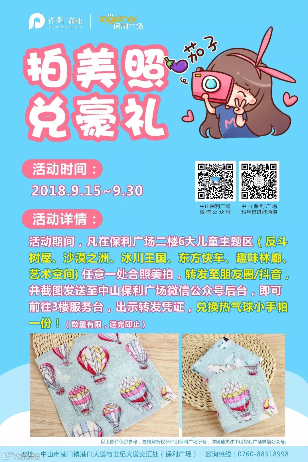 活动期间,挑战一楼中庭“热气球主题互动屏游戏”,游戏结束后,将最终获得的分数进行拍照(拍照时间有限,速度一定要快),关注“中山保利广场”微信公众号,将“分数照片+姓名+联系电话”发送至微信公众号后台进行登记,每周日为结分日,每周排名前3名挑战者,即可获得惊喜奖品一份!