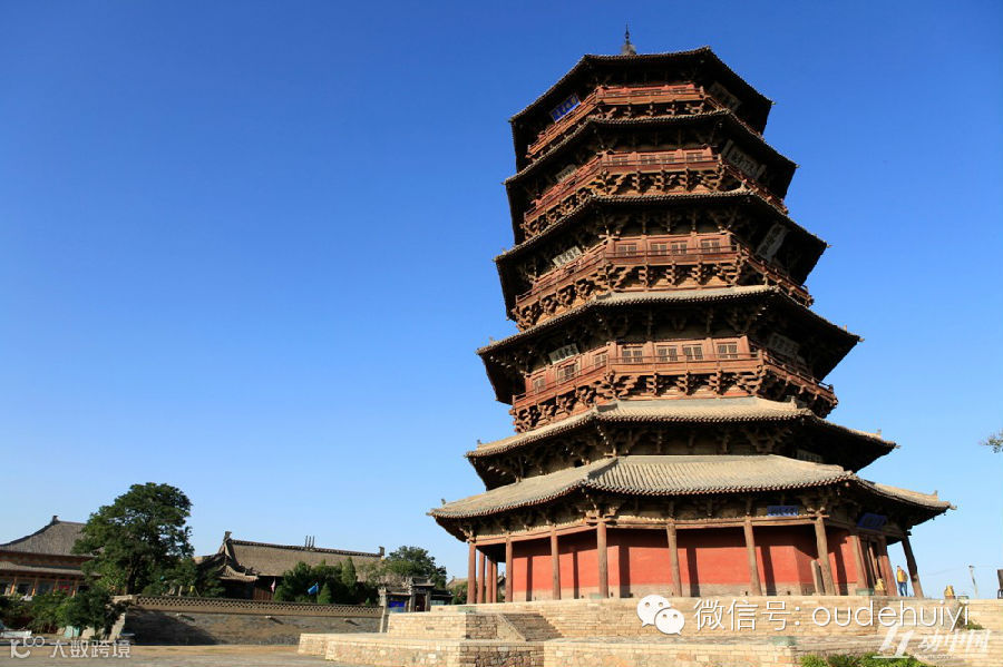 应县木塔是中国现今绝无仅有的最高、最古老的重楼式纯木结构塔,全塔高67.3米,比有名的北京白塔还要高16.4米。塔身共分五层六檐,如果加上内里四层暗层,也可以算是九层。此塔建于辽代清宁二年(公元1056年),至今已历940多年,虽历经了狂风暴雨、强烈地震、炮弹轰击(塔身上弹痕累累,可以看见嵌进去的弹头),仍然屹立。它全靠斗拱、柱梁镶嵌穿插吻合,不用钉不用铆,以50多种斗拱的垫托接联砌建而成。