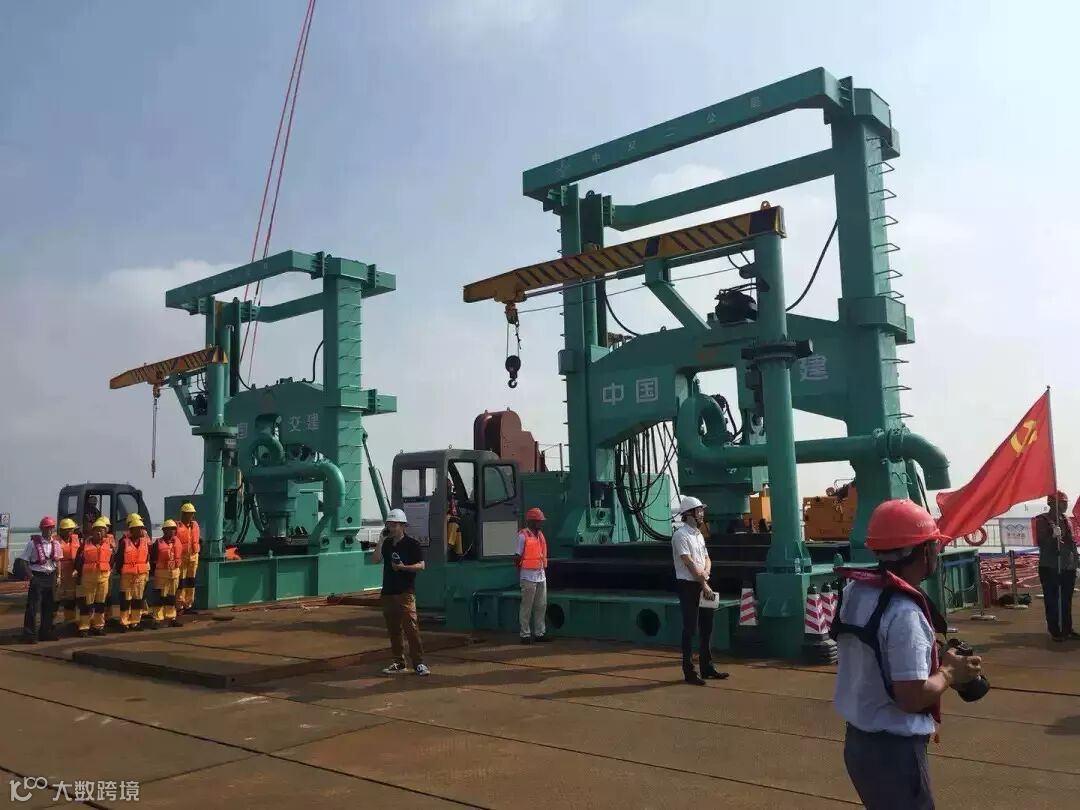 随着现场作业人员通过对讲机传达作业令,钢便桥上超大功率KTY4000型回旋钻机施工发出轰鸣声,在预先打设好的钢护筒中往下深钻,开钻直径达3米的超大钻孔灌注桩。