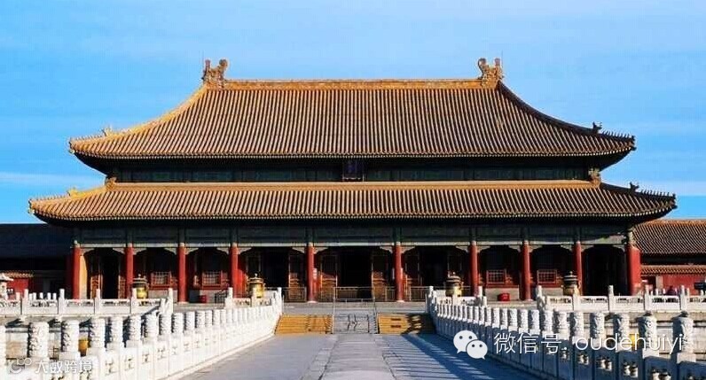 北京故宫的太和殿俗称“金銮殿”,位于北京紫禁城南北主轴线的显要位置,是中国现存最大的木结构大殿。明永乐十八年(1420年)建成,称奉天殿。明嘉靖四十一年(1562年)改称皇极殿。清顺治二年(1645年)改今名。自建成后屡遭焚毁,又多次重建,今天所见为清代康熙三十四年(1695年)重建后的形制。太和殿匾额“建极绥猷”匾,为乾隆皇帝御笔,原件在袁世凯称帝时被换下,已佚。现在的匾额为复制品。