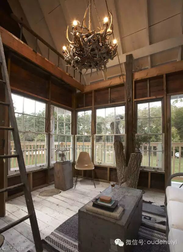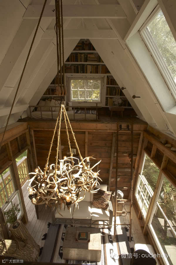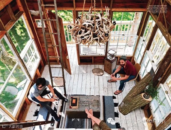 老榆树上的小木屋顶到房间地面的高度大约5.4米,屋内一前一后有两间屋顶阁楼作为卧室,可通过坚固的木结构爬梯到达,首层作为公共客厅。假期与朋友们来到这样的小“基地”聚会是不是相当惬意!?
