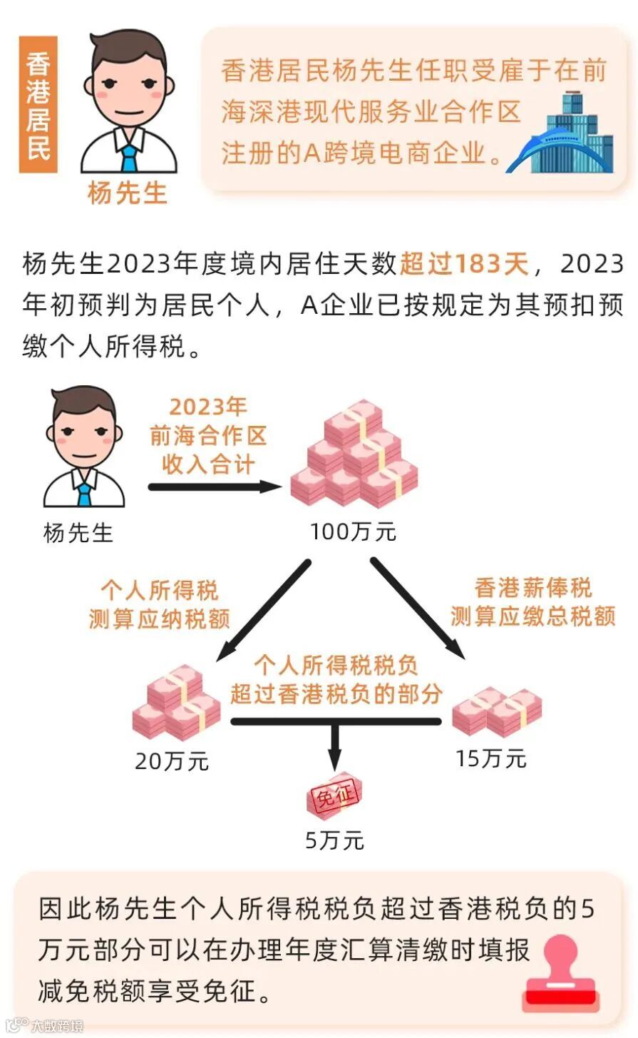 举个例子,香港居民杨先生符合条件,2023年在前海收入100万,按照内地的税制需要纳税20万,按照香港的税制是15万,那么这中间5万的差额可以免掉。