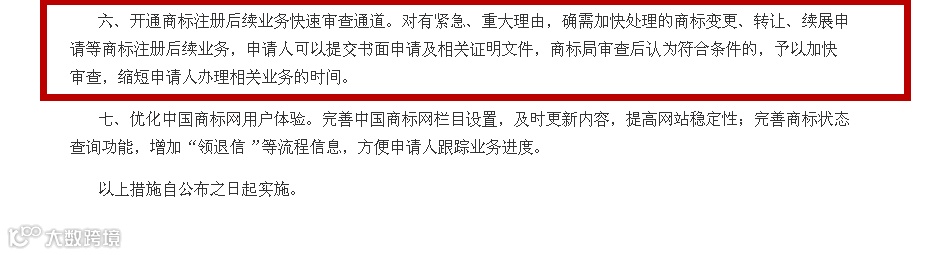 不过,“加急”这事在商标注册后续业务上是存在的。2016年3月,工商总局商标局发布的“践行三严三实”服务商标申请人的七项措施”中,明确提到“开通商标注册后续业务快速审查通道。对有紧急、重大理由,确需加快处理的商标变更、转让、续展申请等商标注册后续业务,申请人可以提交书面申请及相关证明文件,商标局审查后认为符合条件的,予以加快审查,缩短申请人办理相关业务的时间”。