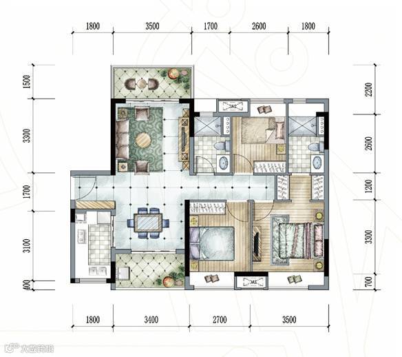 2、采用三房两厅布局,享步入式主卧套间,配备超大衣帽间,精致不失私密性。