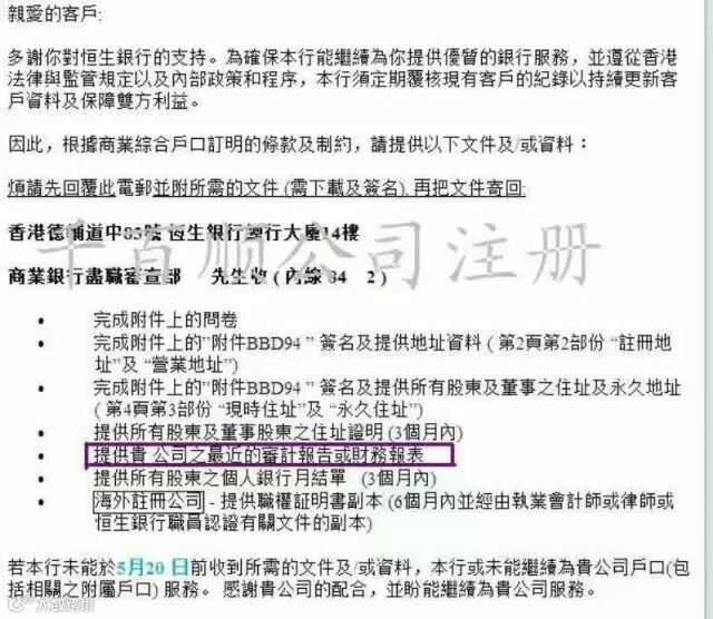 对于拥有银行账户的公司,目前香港汇丰银行、恒生银行已向公司客户下发《调查信》,除需提供常规的公司证明文件外,还需额外提供公司最近的审计报告或财务报表。若不能及时提供可能会被冻结银行账户!