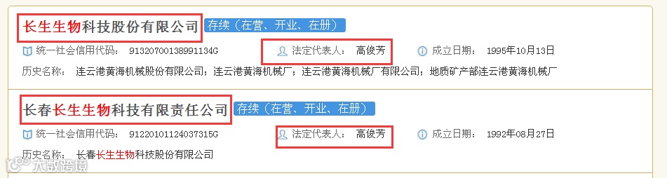 两家公司的法人均为高俊芳,且长生生物科技有限公司为长春生物科技股份有限公司的100%控股子公司。