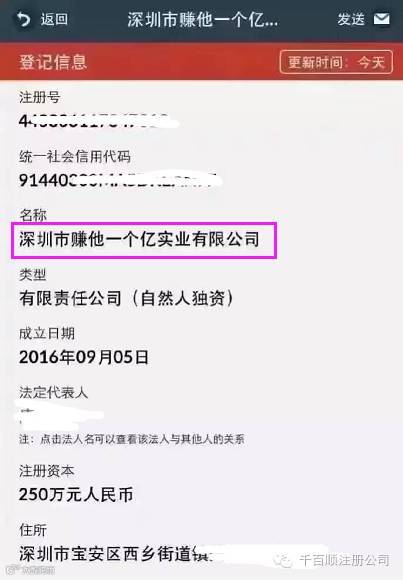 查询工商信息系统发现,“深圳市赚他一个亿实业有限公司”在9月5日注册成立,注册资本为250万元人民币。