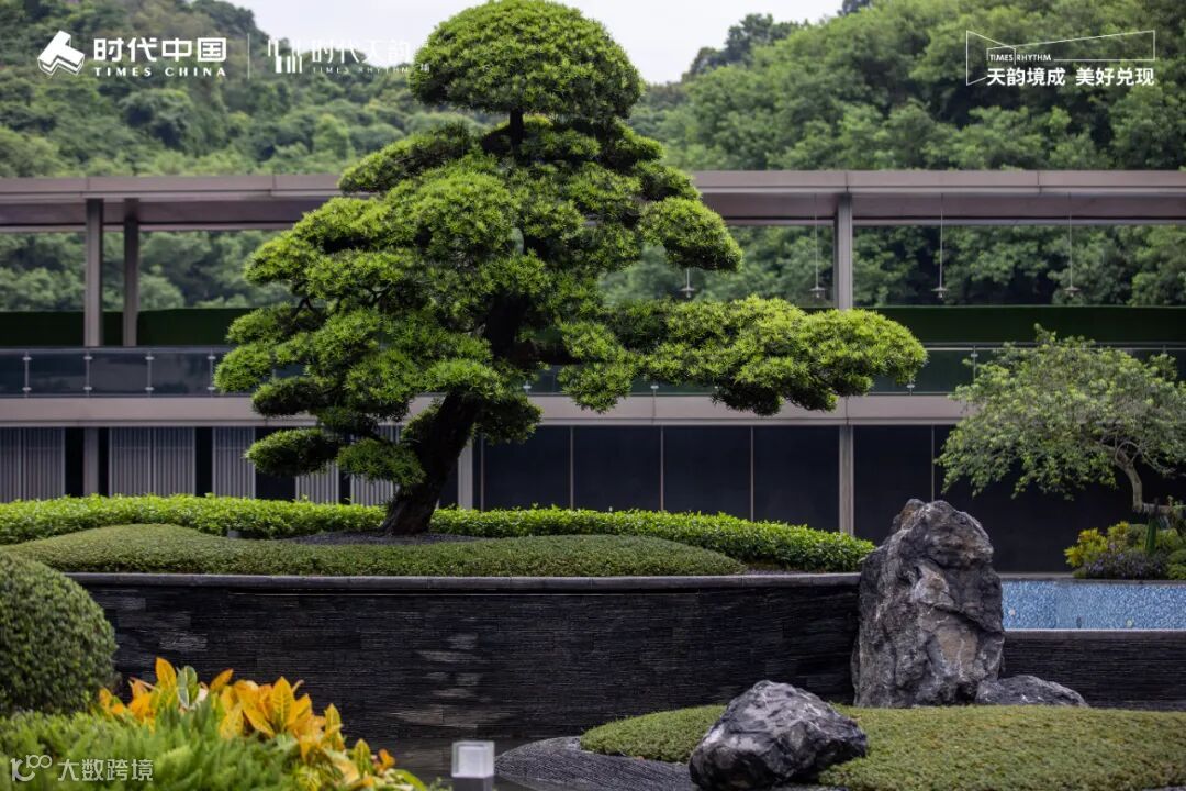 进入大门,8棵全冠幅香樟挺立眼前,视线前方两棵百万级的进口日本罗汉松与璞石水景交相辉映,泳池绿岛还点缀了5棵飘逸美丽的乌桕树,仿佛置身写意画卷。