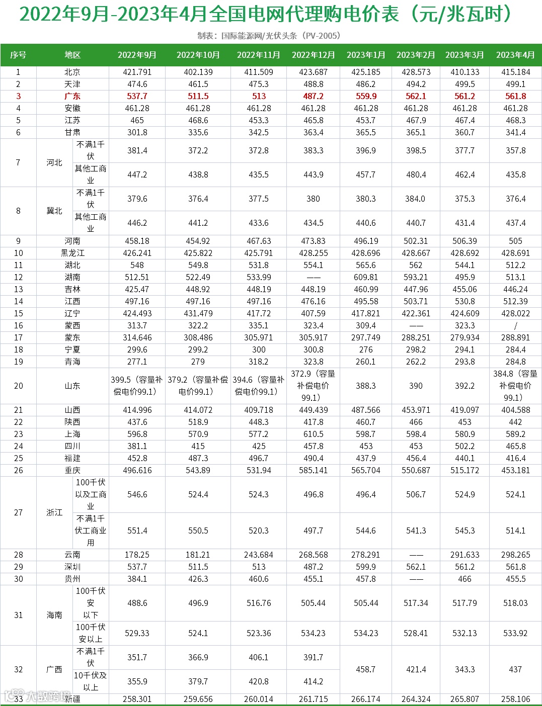 根据2022年9月-2023年4月全国电网代理购电价表中,广东电价且用电量遥遥领先,广东省一直都是光伏从业者的兵家必争之地,发展前景十分广阔。