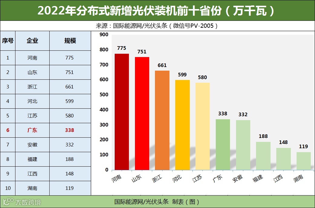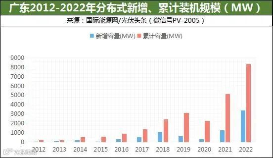 多年以来,广东分布式光伏跟随政策脚步,装机持续增长。据国家能源局公布,2022年广东省光伏新增规模570.2万千瓦,其中分布式光伏新增338.2万千瓦,在全国位列第六。