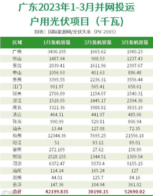 根据广东电网有限责任公司关于属地区域2023年1月至3月并网投运的户用光伏项目信息公布显示,广东1-3月份20个地区并网投运户用光伏项目125GW。