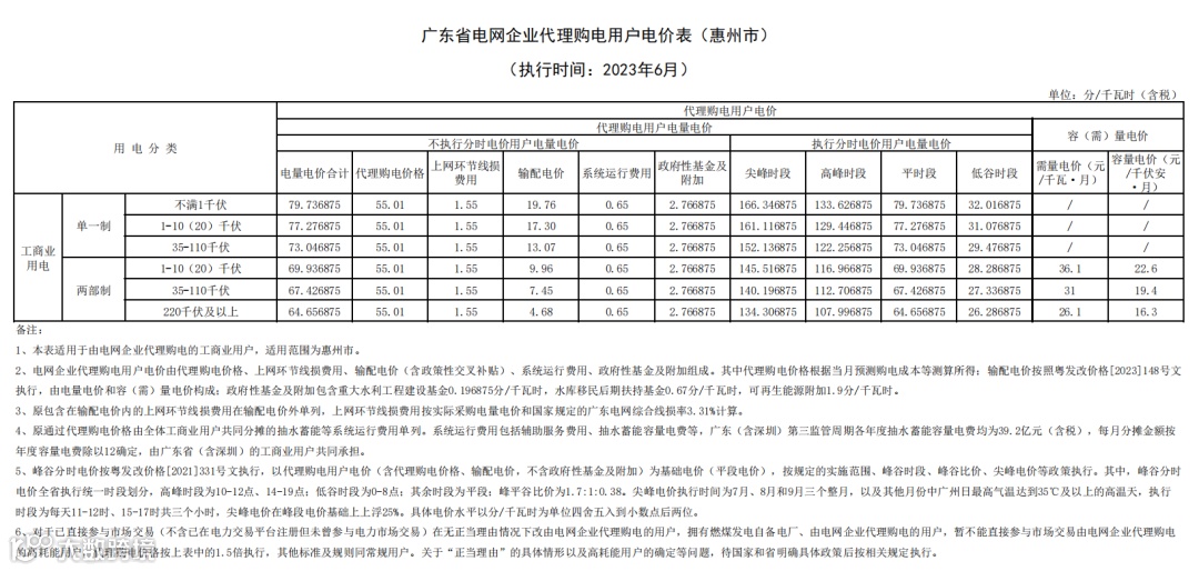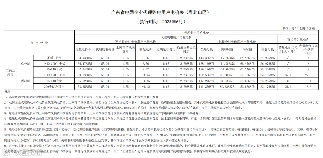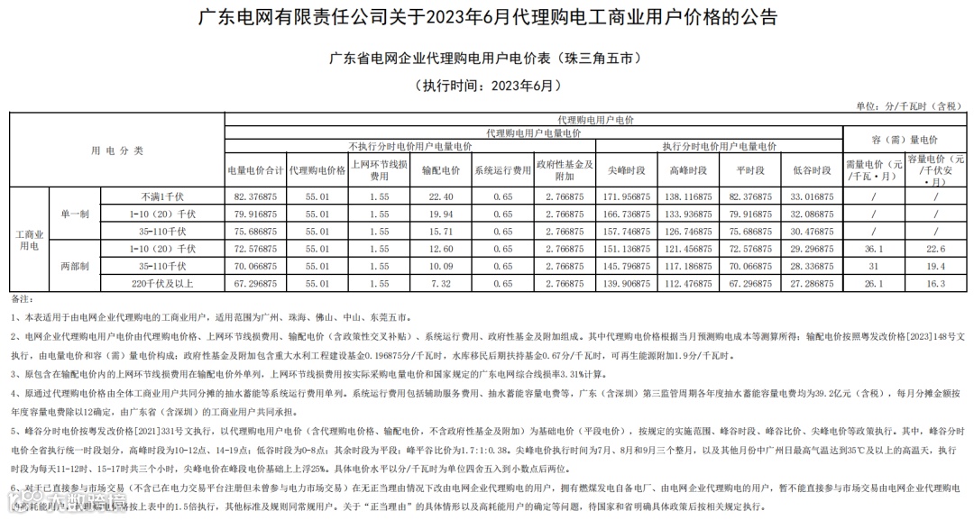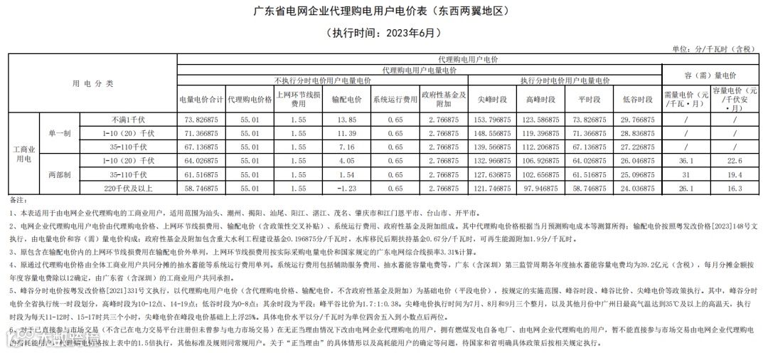 以下为2023年6月广东电网企业代理购电价格表: