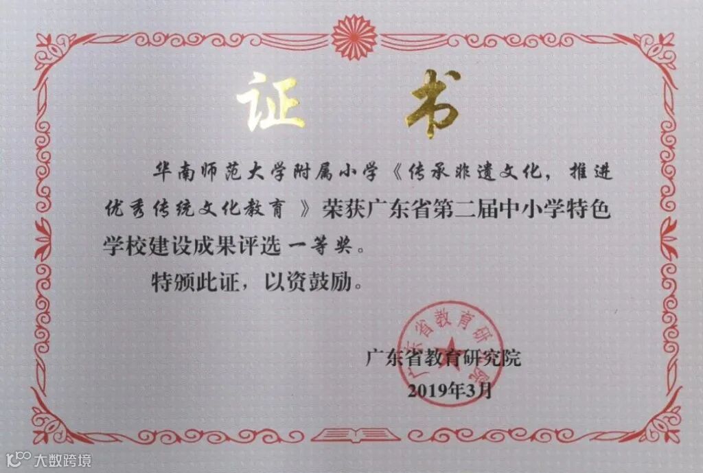2019年广东省中小学特色学校建设成果一等奖