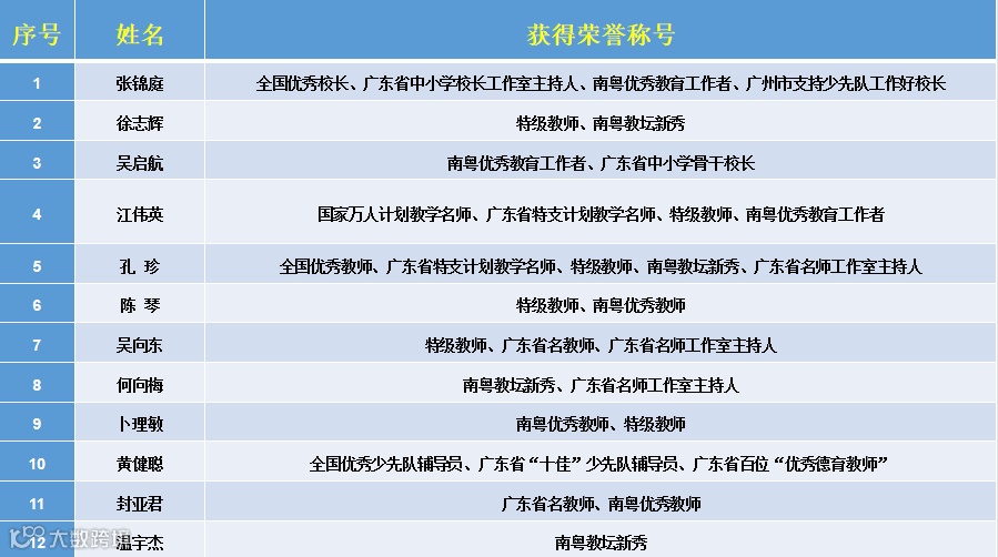 优秀的师资力量,同样是华师附小的强项,有54人次获得省和国家级的荣誉称号,其中全国优秀校长1人,全国优秀教师1人,全国优秀大队辅导员1人,国家“万人计划”教学名师2人,广东省“特支计划”教学名师2人,广东省特级教师7人,广东省名校长工作室主持人1人,广东省名师工作室主持人6人,南粤优秀教师(教育工作者、教坛新秀等)17人,广东省名教师2人,广东省“百千万人才培养工程”培养对象(名教育家、名校长)9人,广东省“十佳”少先队辅导员1人,广州市“十佳”少先队辅导员1人,广东省优秀少先队辅导员3人,省师德标兵3人,省优秀共产党员1人。正高级职称4人,副高级职称35人,硕士研究生25人。全校老师中共有8人持广东省心理健康教师A证,25人持广东省心理健康教师B证。