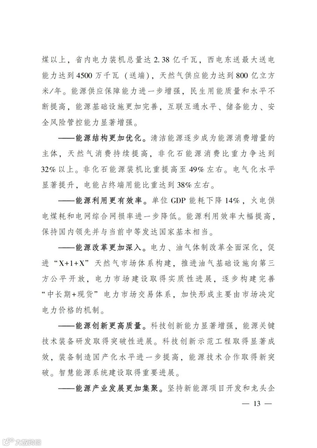 能源结构更加优化。清洁能源逐步成为能源消费增量的主体,天然气消费持续提高,非化石能源消费比重力争达到32%以上。非化石能源装机比重提高至49%左右。电气化水平显著提升,电能占终端用能比重达到38%左右。