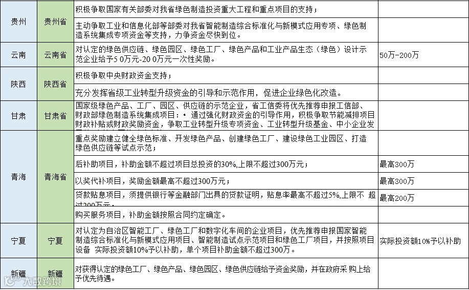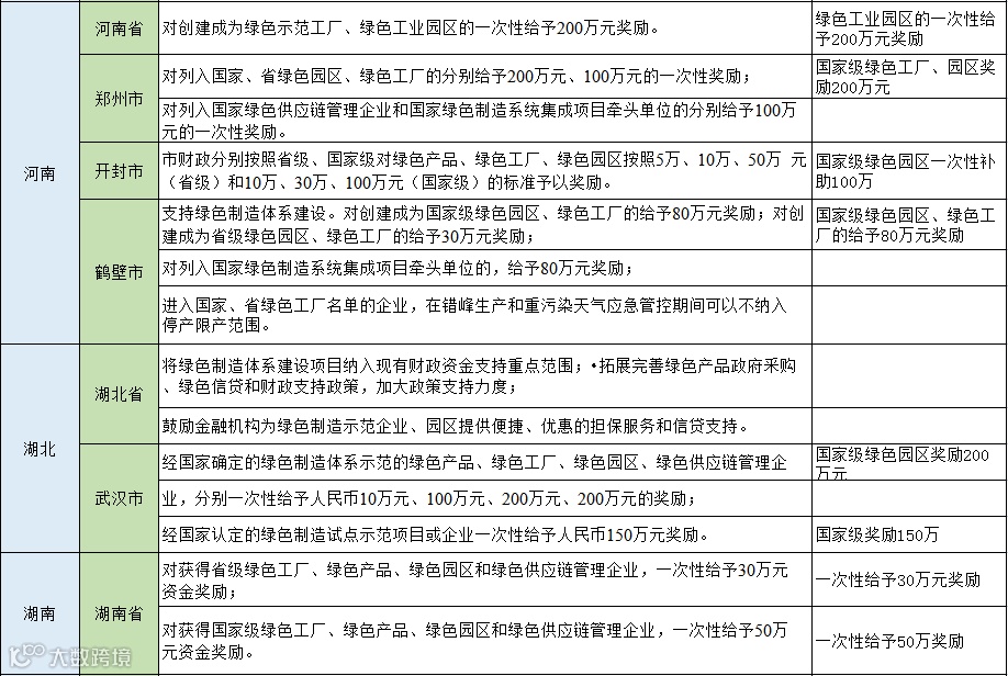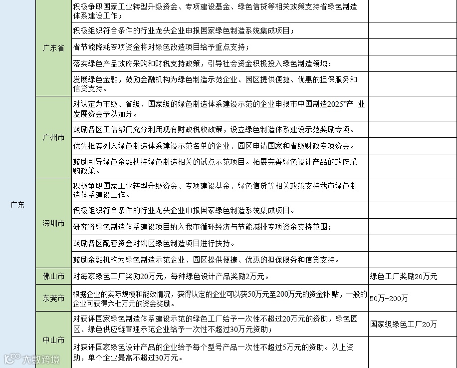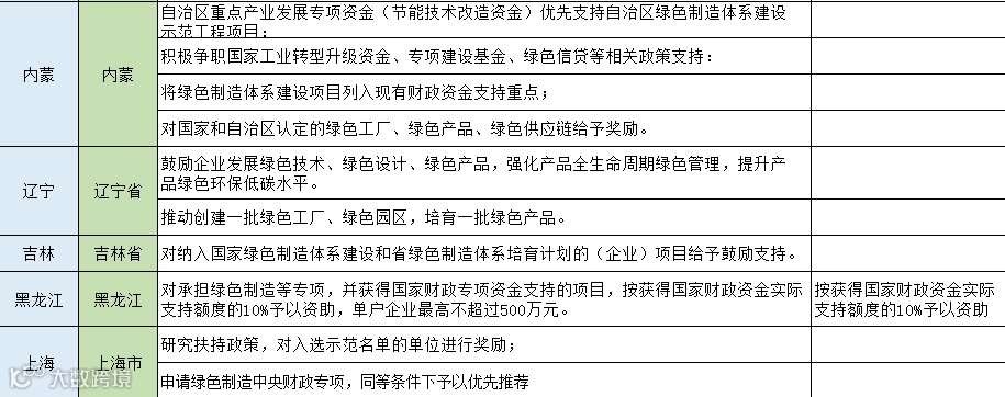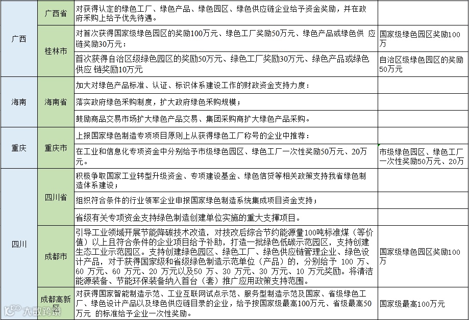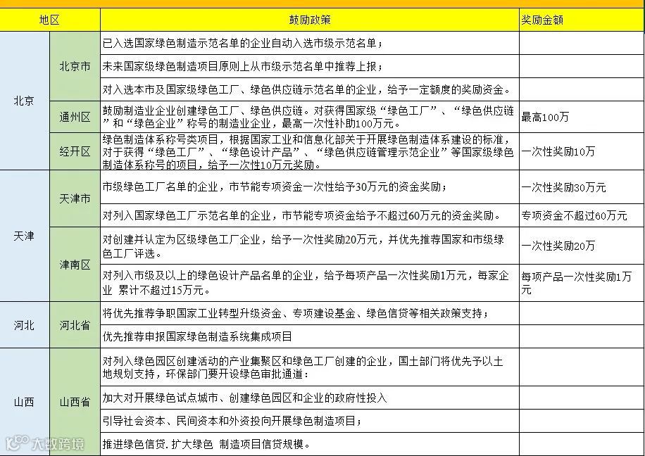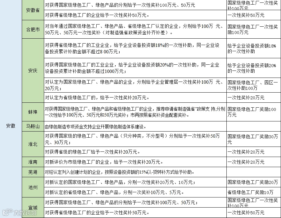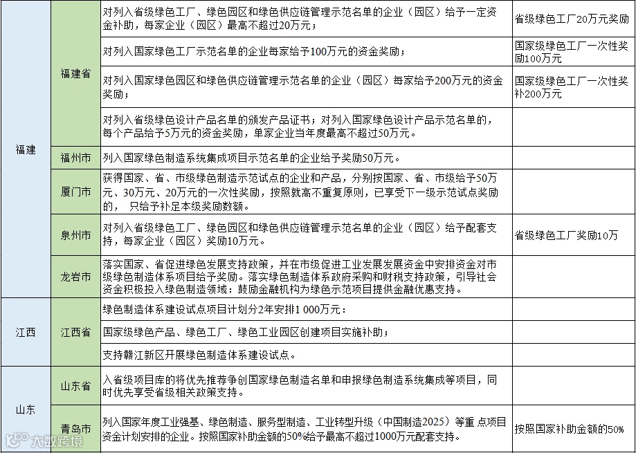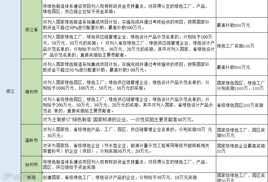 从以下表格可以看出大部分地区对于入选国家级绿色园区、工厂名单的企业将一次性奖励100万元,浙江湖州的奖励金额达到了1000万元,对于入选省级名单多是一次性奖励50万元,同时还有多个城市按照设备投资金额的百分比进行奖励,最高可达800万,分享给大家。