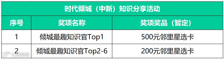 形式可为视频(5分钟左右)、文字(100-200字)等形式,每位业主每月至少完成4次打卡,即可参与“倾城最趣知识官”的评选,最终人气榜前6名可获得精美礼品。