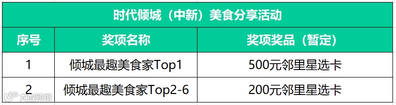 评选规则:已累计在群内打卡4次的业主,可挑选自己最满意的打卡内容参选,后根据投票票数选出倾城最趣美食家Top1-6。下图为相应奖项奖品(暂定):