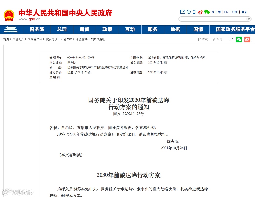 国务院关于印发2030年前碳达峰行动方案的通知