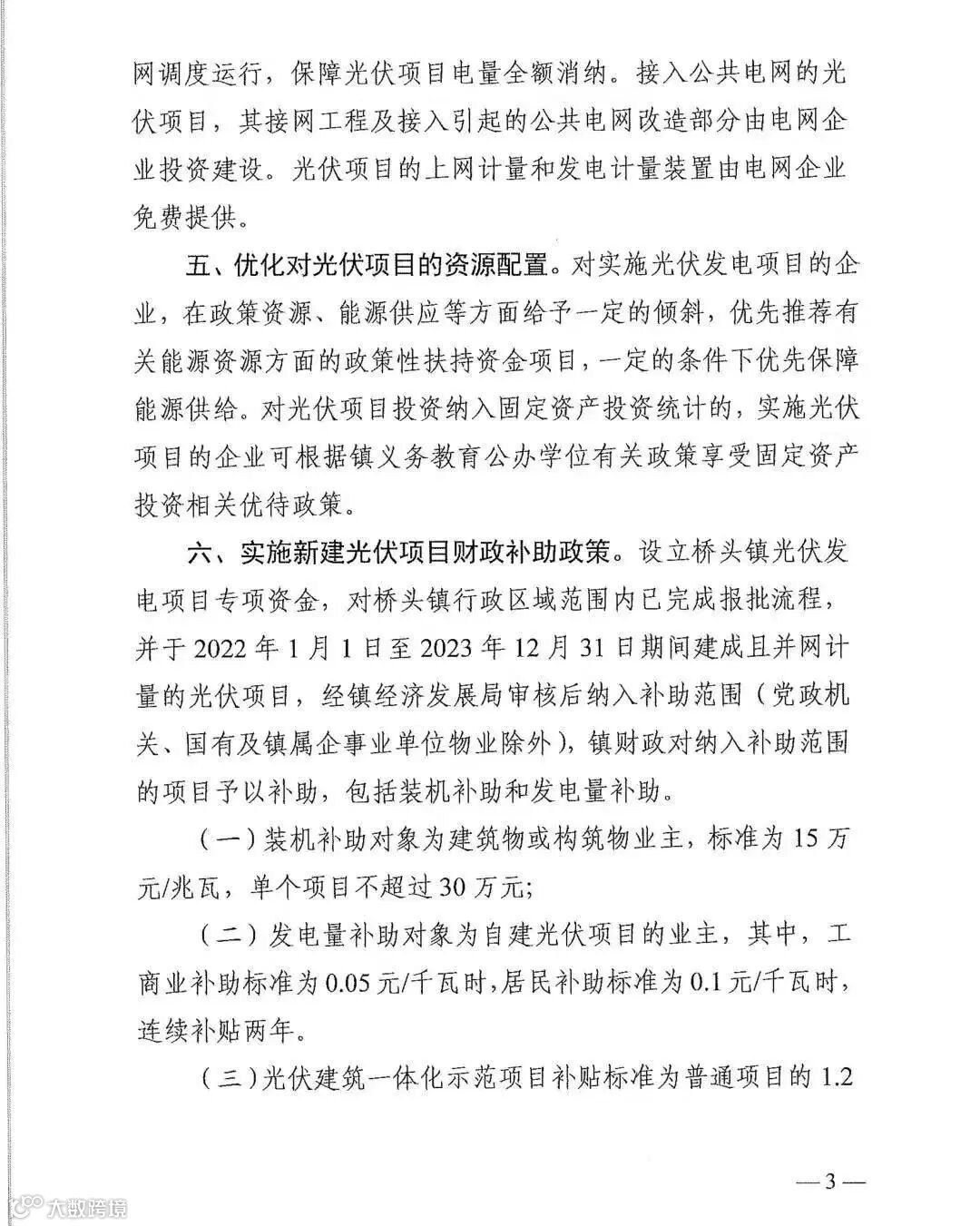 设立桥头镇光伏发电项目专项资金,对桥头镇行政区域范围内已完成报批流程,并于2022年1月1日至2023年12月31日期间建成且并网计量的光伏项目,镇经济发展局审核后纳入补助范围,镇财政对纳入补助范围的项目予以补助: