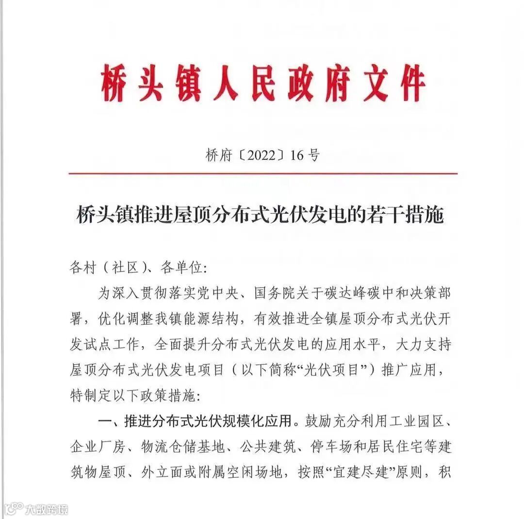 就在此前,东莞市桥头镇人民政府发布《桥头镇推进屋顶分布式光伏发电的若干措施(征求意见稿)》中,对于2022年1月1日至2023年12月31日期间建成且并网计量的光伏项目有资金补助;近日,桥头镇人民政府正式发布相关文件,明确光伏项目资金补助具体事宜同时鼓励该镇企业和居民安装分布式光伏发电。