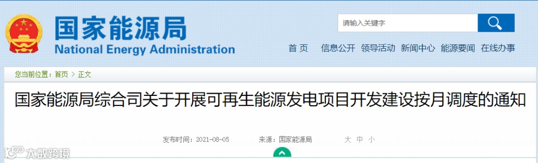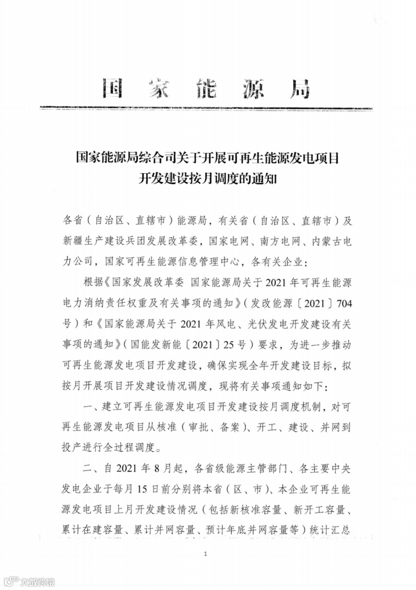 根据《国家发展改革委 国家能源局关于2021年可再生能源电力消纳责任权重及有关事项的通知》(发改能源〔2021〕704号)和《国家能源局关于2021年风电、光伏发电开发建设有关事项的通知》(国能发新能〔2021〕25号)要求,为进一步推动可再生能源发电项目开发建设,确保实现全年开发建设目标,拟按月开展项目开发建设情况调度,现将有关事项通知如下: