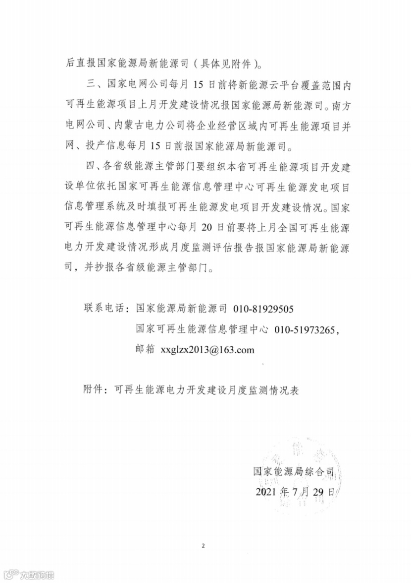 二、自2021年8月起,各省级能源主管部门、各主要中央发电企业于每月15日前分别将本省(区、市)、本企业可再生能源发电项目上月开发建设情况(包括新核准容量、新开工容量、累计在建容量、累计并网容量、预计年底并网容量等)统计汇总后直报国家能源局新能源司(具体见附件)。