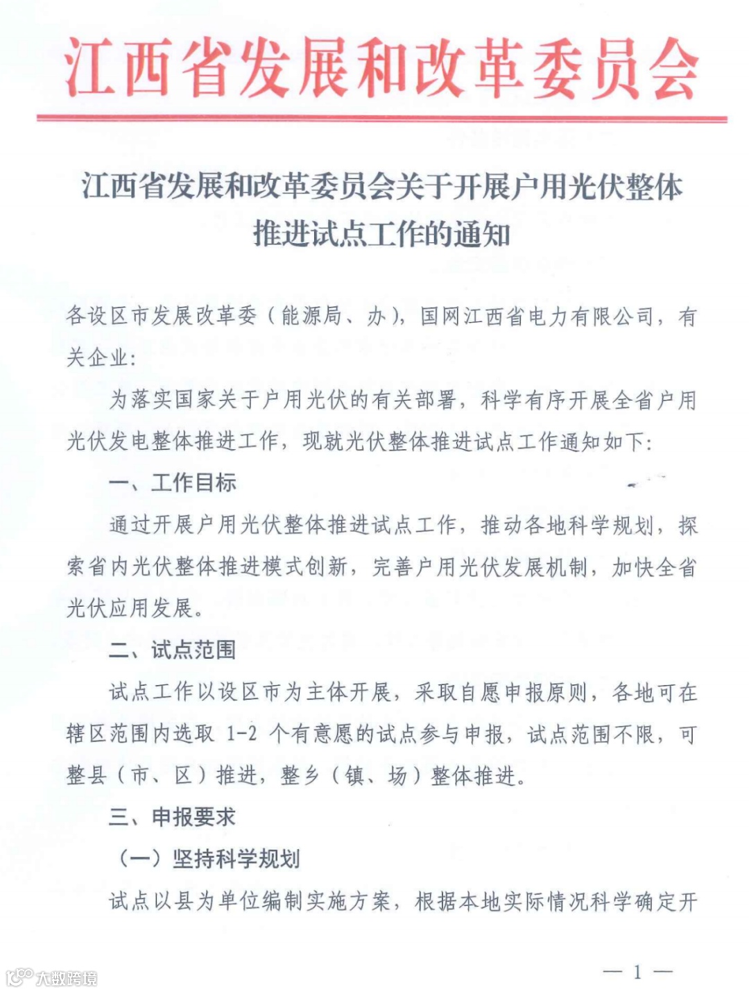 6月11日,江西省发改委下发《关于开展户用光伏整体推进试点工作的通知》,提出:鼓励县企合作,按照自愿的原则,开展户用光伏整县、整镇推进的工作。