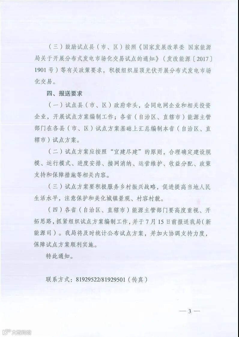 为加快推进分布式光伏发电发展,国家能源局结合实施“千家万户沐光行动”,将组织开展整县(市)推进户用和屋顶分布式光伏开发试点工作。请具备较大规模开发利用屋顶资源、且电网接入和消纳条件良好的地市,积极组织申报试点方案。有关工作要求如下: