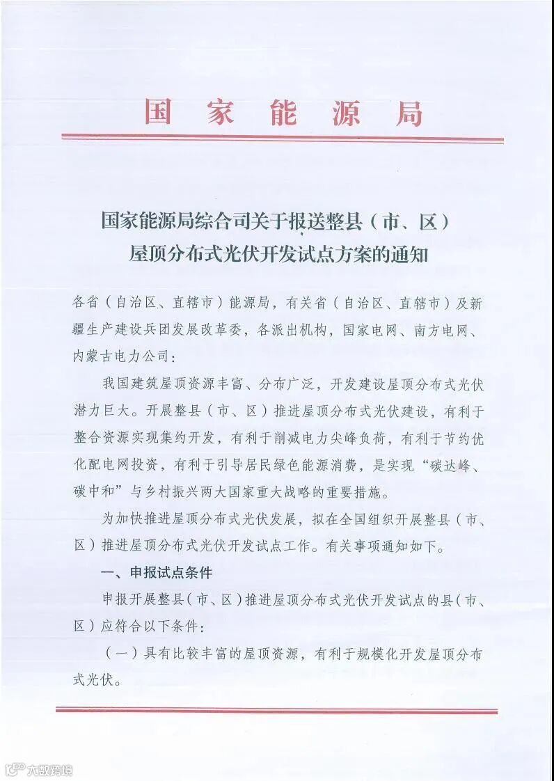 近日,国家能源局综合司下发关于报送整县(市、区)屋顶分布式光伏开发试点方案的通知。