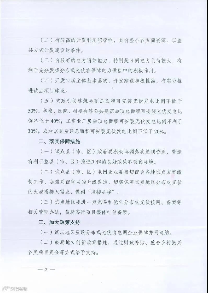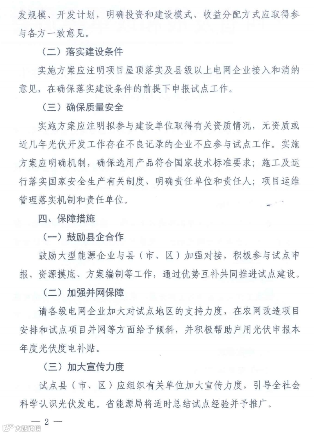 一、具备条件的地市原则上选取一个有代表性的县(市),提出整县(市)试点方案,充分利用农村屋顶、园区屋顶等资源条件开展试点。试点方案需包含试点区域范围、时间安排、任务节点、后期运维、利益分配、保障措施等内容。
