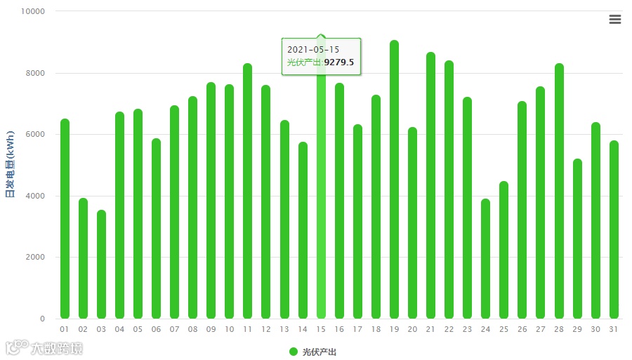 (表3 今年5月发电量数据,5月15日为最高发电量,达9279.5kWh)