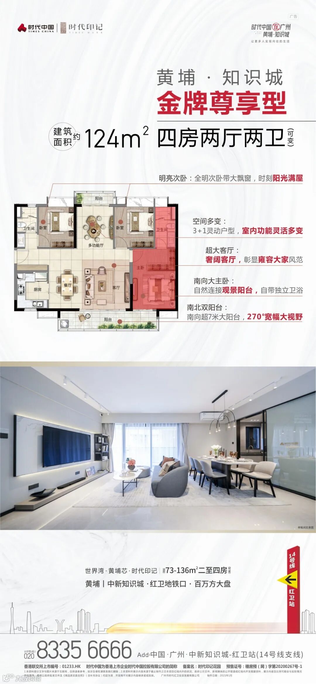 【三地铁,一站到白云】时代印记位于黄埔区14号支线红卫站口,三条地铁线环绕。[14号支线] 一站即到白云新和。[14号线] 快线3站到嘉禾望岗(已开通)。[21号线] 镇龙换乘21号线畅达天河员村。地铁[18号线]北延线(建设中)将接驳14号线,红卫出发快线4站即达广州东站。
