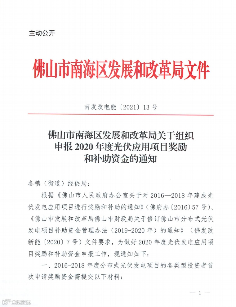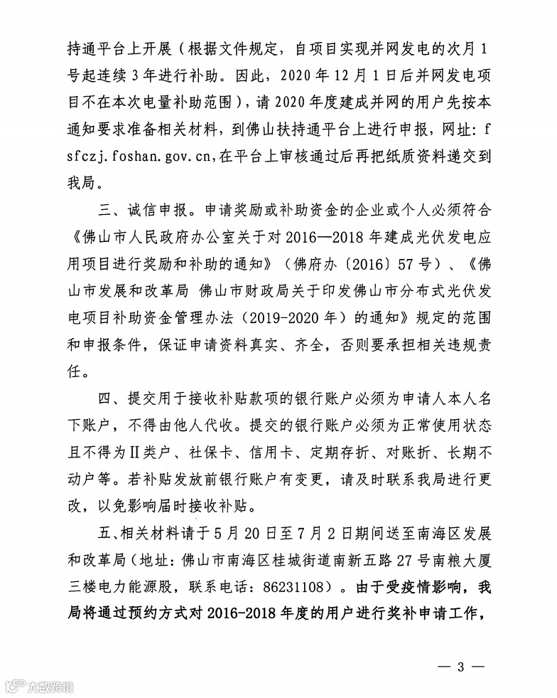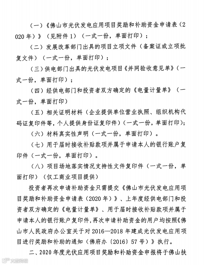 此前,佛山市南海区发改局在组织申报2020年度光伏应用项目奖励和补助资金的通知中明确,2020年度光伏应用项目奖励和补助资金申报于佛山扶持通平台上开展(根据文件规定,自项目实现并网发电的次月1号起连续3年进行补助。因此,2020年12月1日后并网发电项目不在本次电量补助范围),请2020年度建成并网的用户先按本通知要求准备相关材料,到佛山扶持通平台上进行申报。