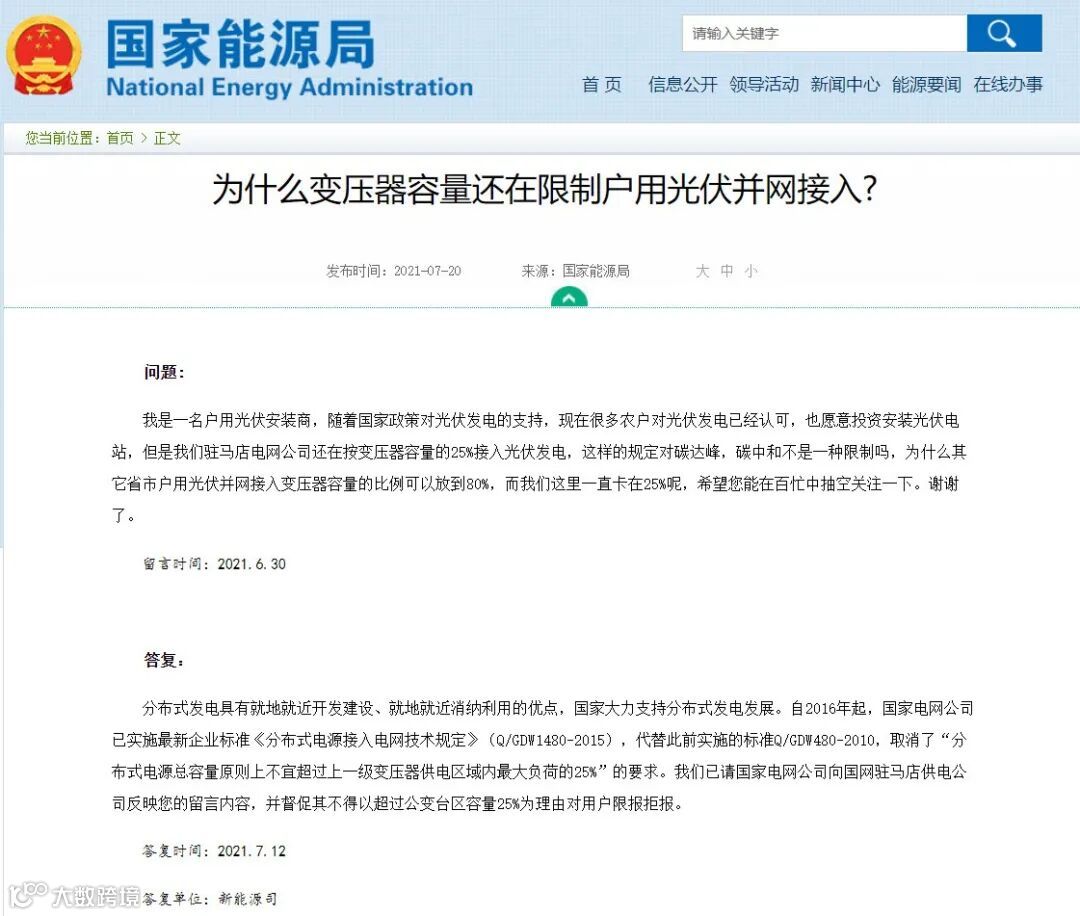 分布式发电具有就地就近开发建设、就地就近消纳利用的优点,国家大力支持分布式发电发展。自2016年起,国家电网公司已实施最新企业标准《分布式电源接入电网技术规定》(Q/GDW1480-2015),代替此前实施的标准Q/GDW480-2010,取消了“分布式电源总容量原则上不宜超过上一级变压器供电区域内最大负荷的25%”的要求。我们已请国家电网公司向国网驻马店供电公司反映您的留言内容,并督促其不得以超过公变台区容量25%为理由对用户限报拒报。