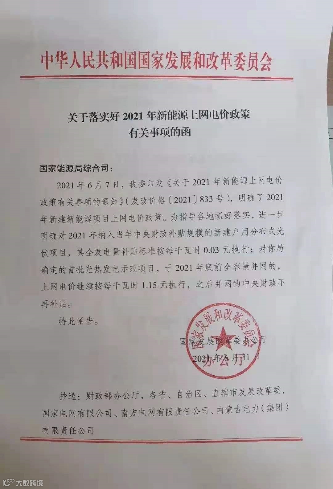 对2021年纳入当年中央财政补贴规模的新建户用分布式光伏项目,其全发电量补贴标准按每千瓦时0.03元执行;对能源局确定的首批光热发电示范项目,于2021年底前全容量并网的,上网电价继续按每千瓦时1.15元执行,之后并网的中央财政不再补贴!