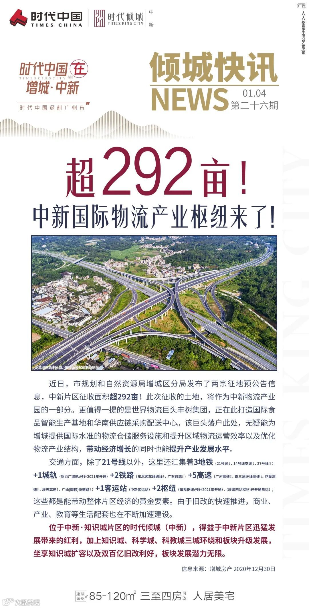 中新片区征收面积超292亩,将作为中新国际物流产业枢纽,世界物流巨头丰树集团更是落户于此,提供国际物流水准;此外,未来将形成3地铁+1城轨+2铁路+5高速+1客运站+2枢纽的便利交通格局。(数据来源:增城房产)