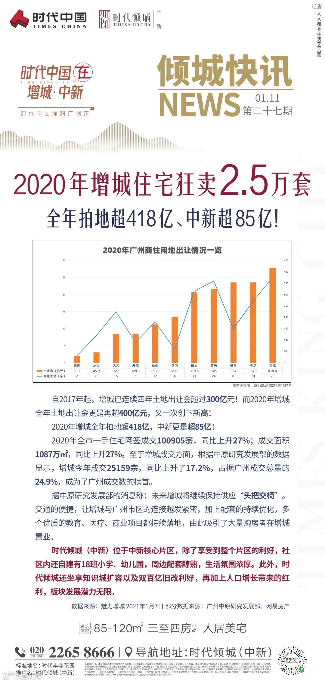 2020年增城住宅热销2.5万套,全年拍地超418亿,中新镇更是超85亿,稳坐头把交椅!衣食住行全面发展,潜力无限。入主中新,畅享多元生活。(数据来源:魅力增城、广州中原研究发展部、网易房产)