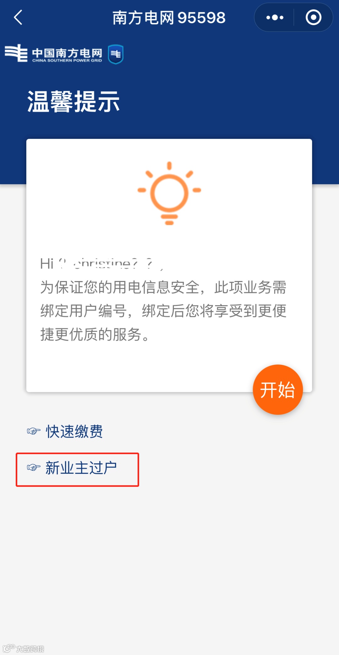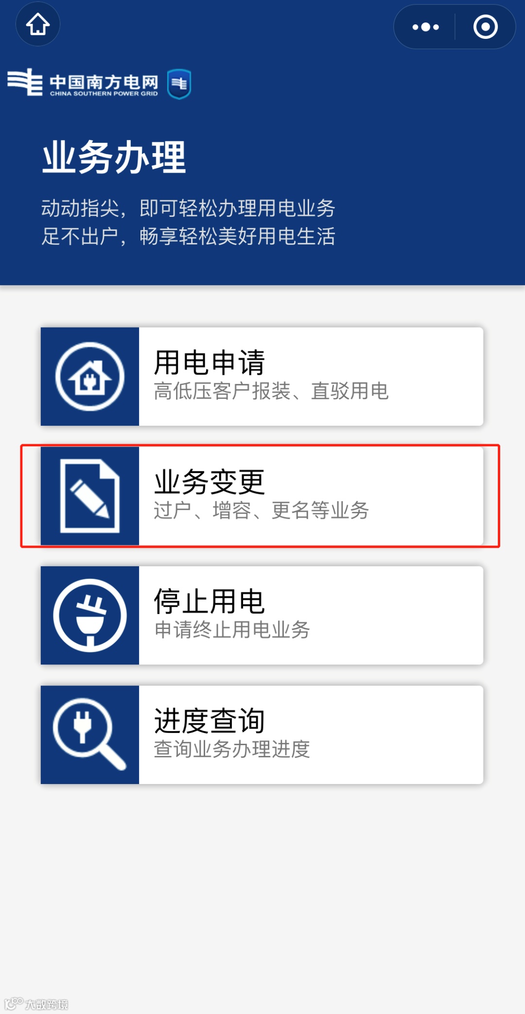 2.点击「我的用电」—「业务办理」—「业务变更」—「新业主过户」—「办理」—「广州供电」;