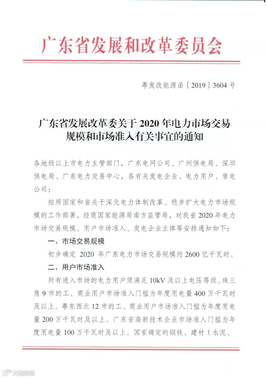 近日,广东省发展和改革委员会发布《广东省发展改革委关于2020年电力市场交易规模和市场准入有关事宜的通知》,正式确定广东省2020年电力市场交易规模、用户市场准入、发电企业主体等安排。市场规模初步确定2020年广东电力市场交易规模约为2600亿千瓦时。