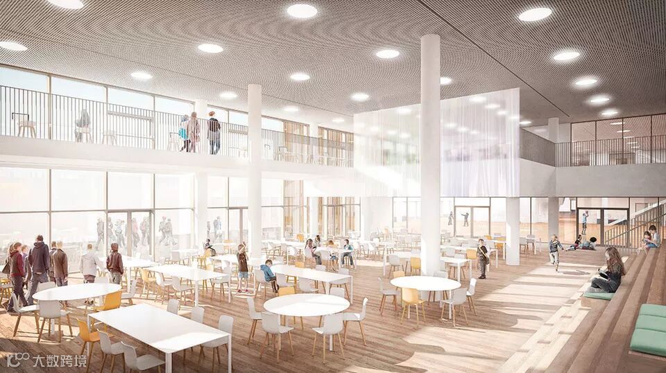 此外基础层上方的屋顶花园作为全校共用的屋顶操场,该操场十分安全,可以防止学生靠近场地的水域以及放置他们过于远离校舍。