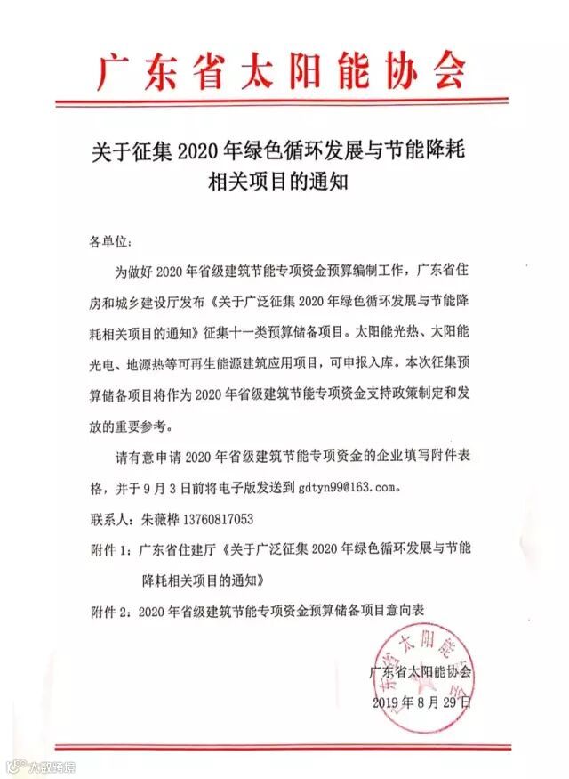 为做好2020年省级建筑节能专项资金预算编制工作,广东省住房和城乡建设厅发布《关于广泛征集2020年绿色循环发展与节能降耗相关项目的通知》征集十一类预算储备项目。太阳能光热、太阳能光电、地源热等可再生能源建筑应用项目,可申报入库。