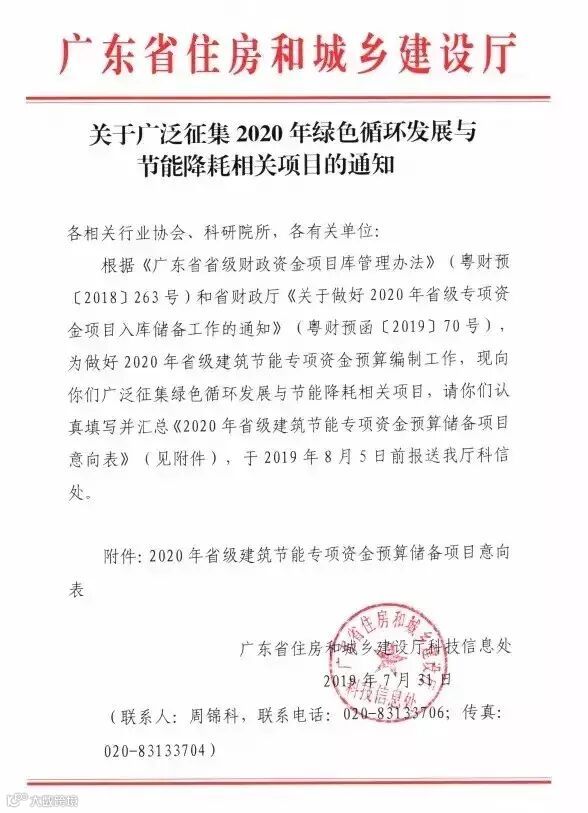 日前,广东省住房和城乡建设厅发布《关于广泛征集2020年绿色循环发展与节能降耗相关项目的通知》,下附原文: