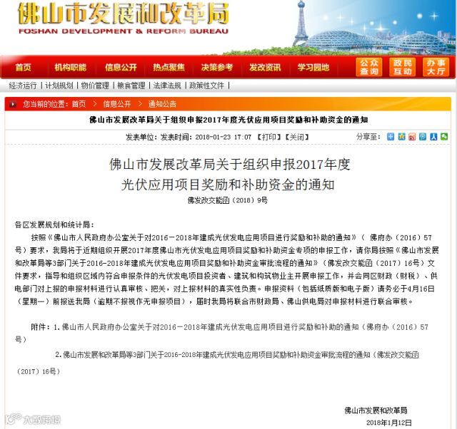 上周,佛山市发展和改革局下发通知,组织开展2016-2018年度佛山市光伏发电应用项目奖励和补助资金专项的申报工作。