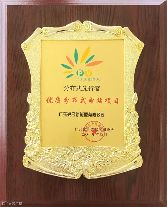 在第九届广州国际太阳能光伏展•优质分布式发电站颁奖典礼上,光合能源荣获“分布式先行者•优秀分布式电站项目”一奖,该奖由广州国际太阳能光伏展组委会颁发。